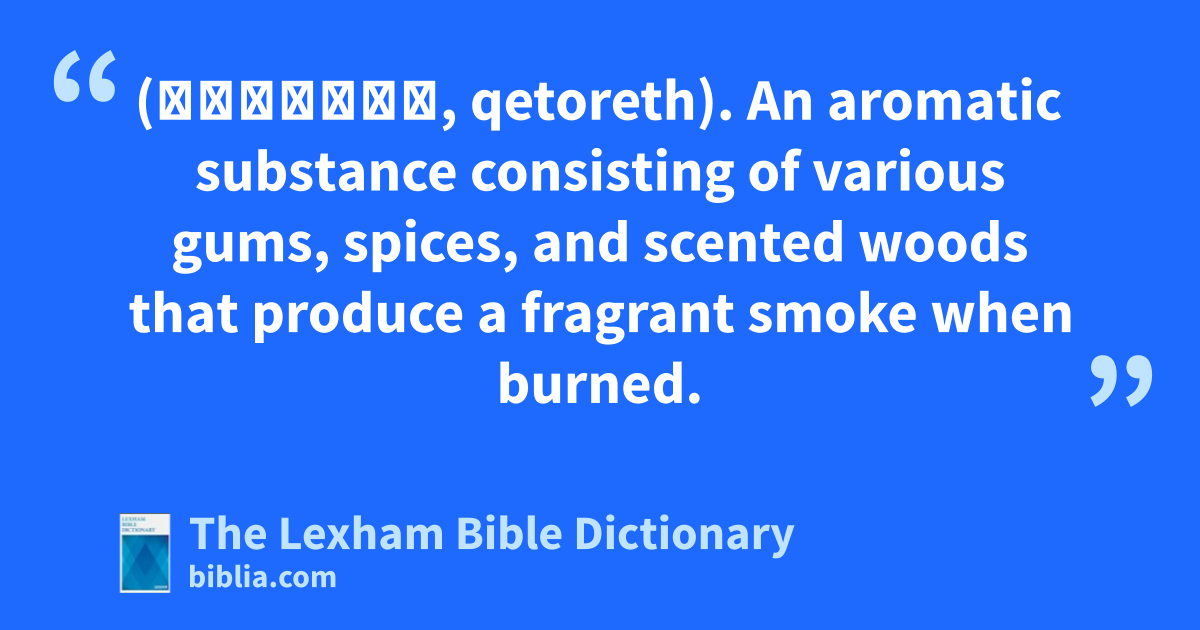 Incense (קְטֺרֶת, qetoreth). An aromatic substance consisting of various gums, spices, and scented woods that produce a fragrant smoke when burned.