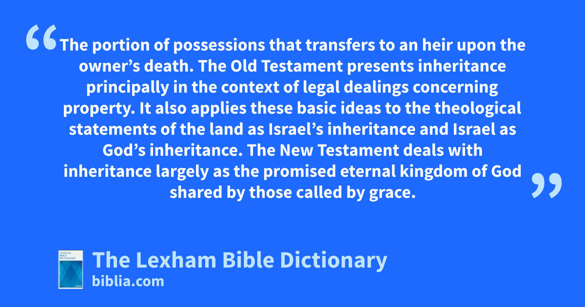 The Old Testament presents inheritance principally in the context of legal dealings concerning property. It also applies these basic ideas to the theological statements of the land as Israel’s inheritance and Israel as God’s inheritance. The New Testament deals with inheritance largely as the promised eternal kingdom of God shared by those called by grace.