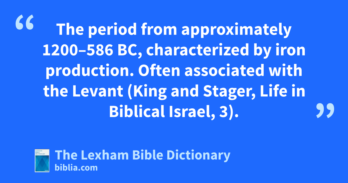 Iron Age The period from approximately 1200–586 bc, characterized by iron production. Often associated with the Levant (King and Stager, Life in Biblical Israel, 3).