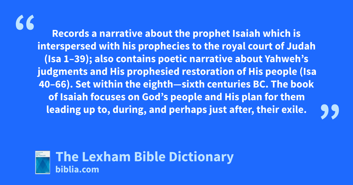 Isaiah, Book Of Records a narrative about the prophet Isaiah which is interspersed with his prophecies to the royal court of Judah (Isa 1–39); also contains poetic narrative about Yahweh’s judgments and His prophesied restoration of His people (Isa 40–66). Set within the eighth—sixth centuries bc. The book of Isaiah focuses on God’s people and His plan for them leading up to, during, and perhaps just after, their exile.