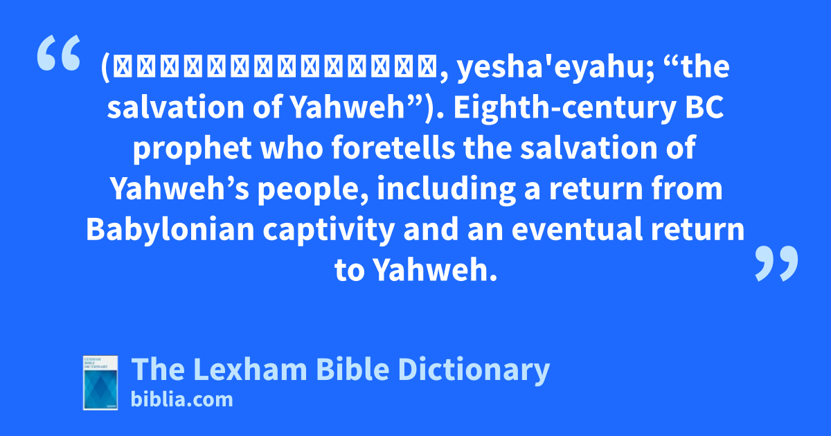 Isaiah the Prophet (יְשַֽׁעְיָ֣הוּ, yesha'eyahu; “the salvation of Yahweh”). Eighth-century bc prophet who foretells the salvation of Yahweh’s people, including a return from Babylonian captivity and an eventual return to Yahweh.