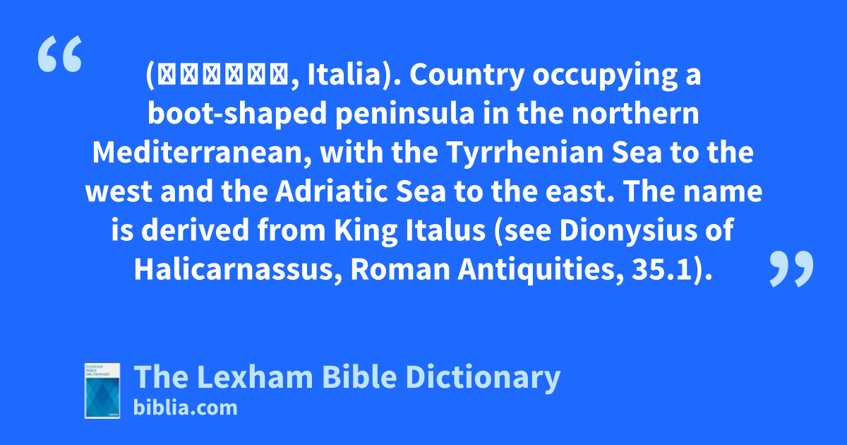 Italy (Ἰταλία, Italia). Country occupying a boot-shaped peninsula in the northern Mediterranean, with the Tyrrhenian Sea to the west and the Adriatic Sea to the east. The name is derived from King Italus (see Dionysius of Halicarnassus, Roman Antiquities, 35.1).