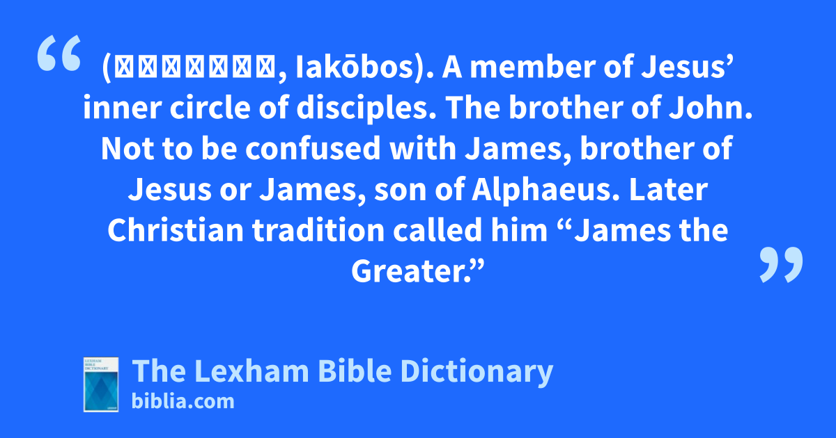 James, Son of Zebedee (Ἰάκωβος, Iakōbos). A member of Jesus’ inner circle of disciples. The brother of John. Not to be confused with James, brother of Jesus or James, son of Alphaeus. Later Christian tradition called him “James the Greater.”