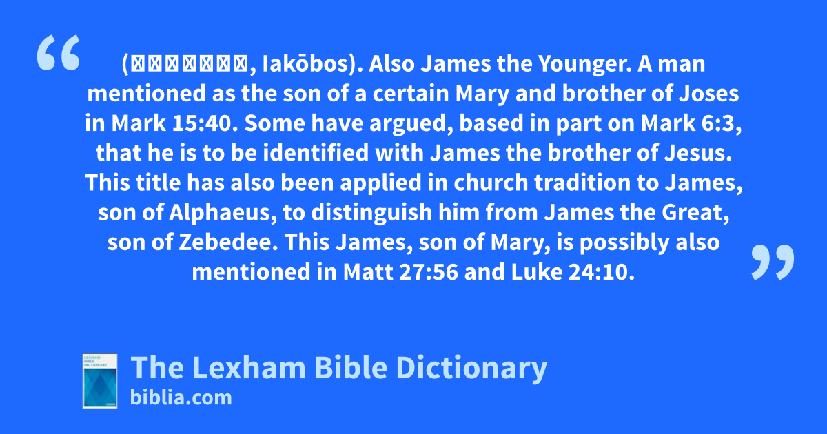 James the Less (Ἰάκωβος, Iakōbos). Also James the Younger. A man mentioned as the son of a certain Mary and brother of Joses in Mark 15:40. Some have argued, based in part on Mark 6:3, that he is to be identified with James the brother of Jesus. This title has also been applied in church tradition to James, son of Alphaeus, to distinguish him from James the Great, son of Zebedee. This James, son of Mary, is possibly also mentioned in Matt 27:56 and Luke 24:10.
