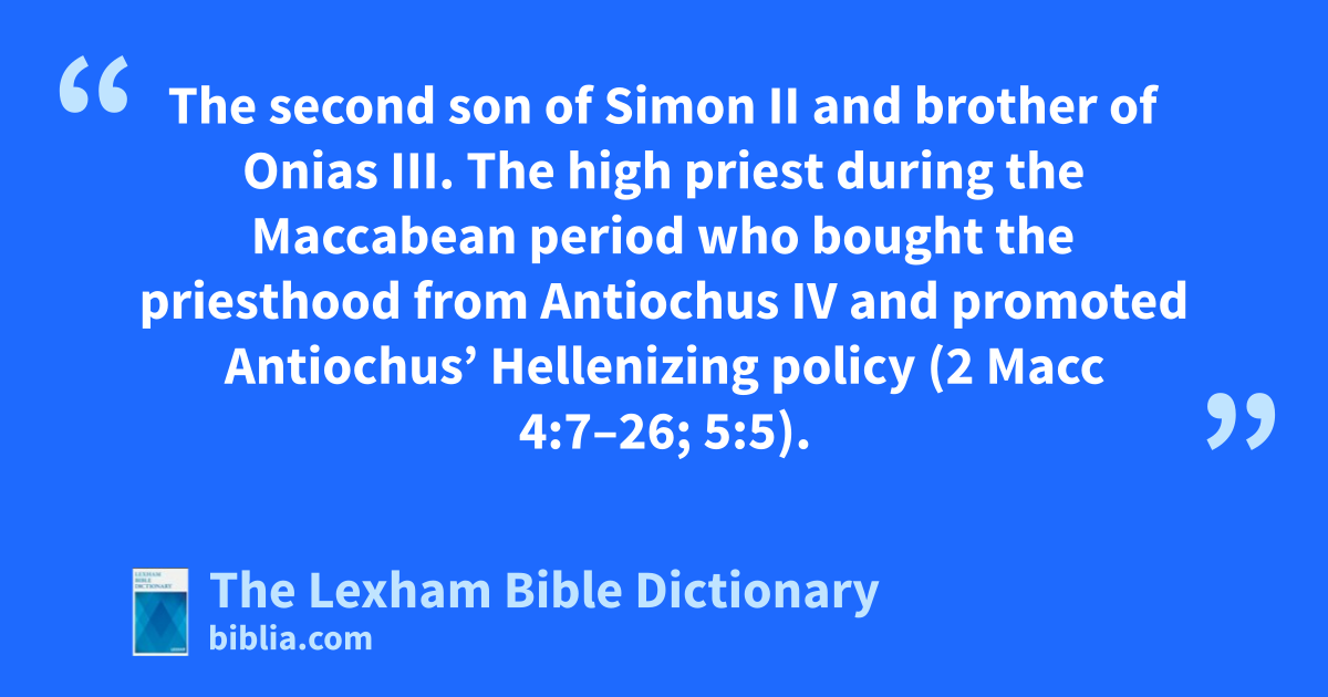 Jason the High Priest The second son of Simon II and brother of Onias III. The high priest during the Maccabean period who bought the priesthood from Antiochus IV and promoted Antiochus’ Hellenizing policy (2 Macc 4:7–26; 5:5).