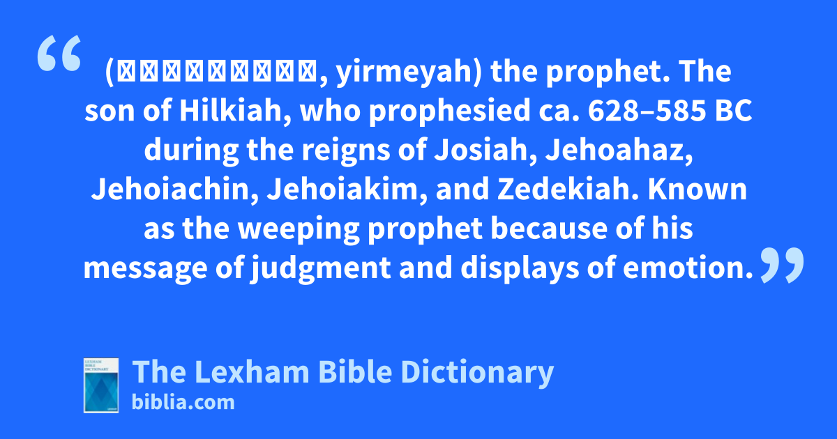 Jeremiah the Prophet (יִרְמְיָה, yirmeyah) the prophet. The son of Hilkiah, who prophesied ca. 628–585 bc during the reigns of Josiah, Jehoahaz, Jehoiachin, Jehoiakim, and Zedekiah. Known as the weeping prophet because of his message of judgment and displays of emotion.