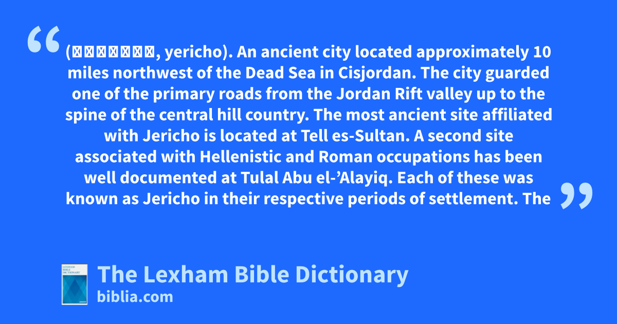Jericho (יְרִחוֹ, yericho). An ancient city located approximately 10 miles northwest of the Dead Sea in Cisjordan. The city guarded one of the primary roads from the Jordan Rift valley up to the spine of the central hill country.