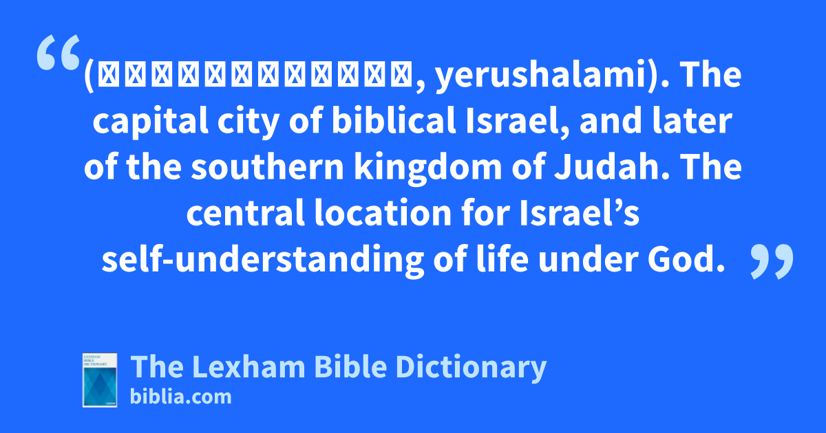 Jerusalem (יְרוּשָׁלַםִ, yerushalami). The capital city of biblical Israel, and later of the southern kingdom of Judah. The central location for Israel’s self-understanding of life under God.