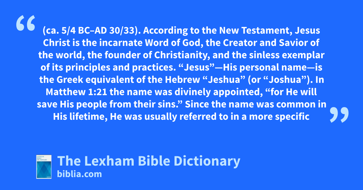 Jesus Christ (ca. 5/4 bc–ad 30/33). According to the New Testament, Jesus Christ is the incarnate Word of God, the Creator and Savior of the world, the founder of Christianity, and the sinless exemplar of its principles and practices. “Jesus”—His personal name—is the Greek equivalent of the Hebrew “Jeshua” (or “Joshua”). In Matthew 1:21 the name was divinely appointed, “for He will save His people from their sins.” Since the name was common in His lifetime, He was usually referred to in a more specific way, such as “Jesus of Nazareth” (John 1:26; Schaeder, “Nazarēnos, Nazōraios,” 874–79). “Christ,” the anointed one, is a title that acknowledged that He was the expected Messiah of Israel. In the Gospels, Jesus is usually identified as “the Christ.” After Peter’s sermon at Pentecost in Acts 2:38, He was usually referred to as “Jesus Christ.” This composite name joins the historic figure with the messianic role that prophetic expectation and early Christianity knew that He possessed.