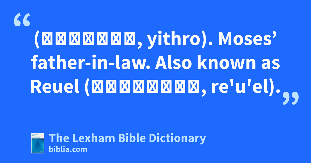 Jethro (יִתְרוֹ, yithro). Moses’ father-in-law. Also known as Reuel (רְעוּאֵל, re'u'el).