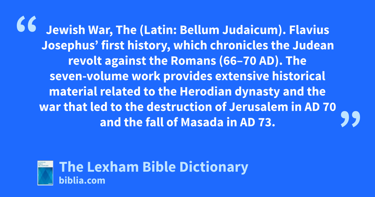 Jewish War, The Jewish War, The (Latin: Bellum Judaicum). Flavius Josephus’ first history, which chronicles the Judean revolt against the Romans (66–70 ad). The seven-volume work provides extensive historical material related to the Herodian dynasty and the war that led to the destruction of Jerusalem in ad 70 and the fall of Masada in ad 73.