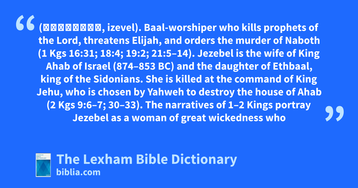 Jezebel, Wife of Ahab, Daughter of Ethbaal (אִיזֶבֶל, izevel). Baal-worshiper who kills prophets of the Lord, threatens Elijah, and orders the murder of Naboth (1 Kgs 16:31; 18:4; 19:2; 21:5–14). Jezebel is the wife of King Ahab of Israel (874–853 bc) and the daughter of Ethbaal, king of the Sidonians. She is killed at the command of King Jehu, who is chosen by Yahweh to destroy the house of Ahab (2 Kgs 9:6–7; 30–33).