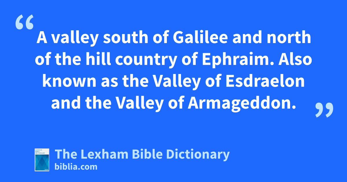 Jezreel of Issachar A valley south of Galilee and north of the hill country of Ephraim. Also known as the Valley of Esdraelon and the Valley of Armageddon.