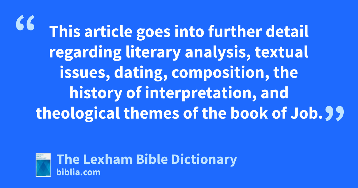 Job, Book of, Critical Issues This article goes into further detail regarding literary analysis, textual issues, dating, composition, the history of interpretation, and theological themes of the book of Job.