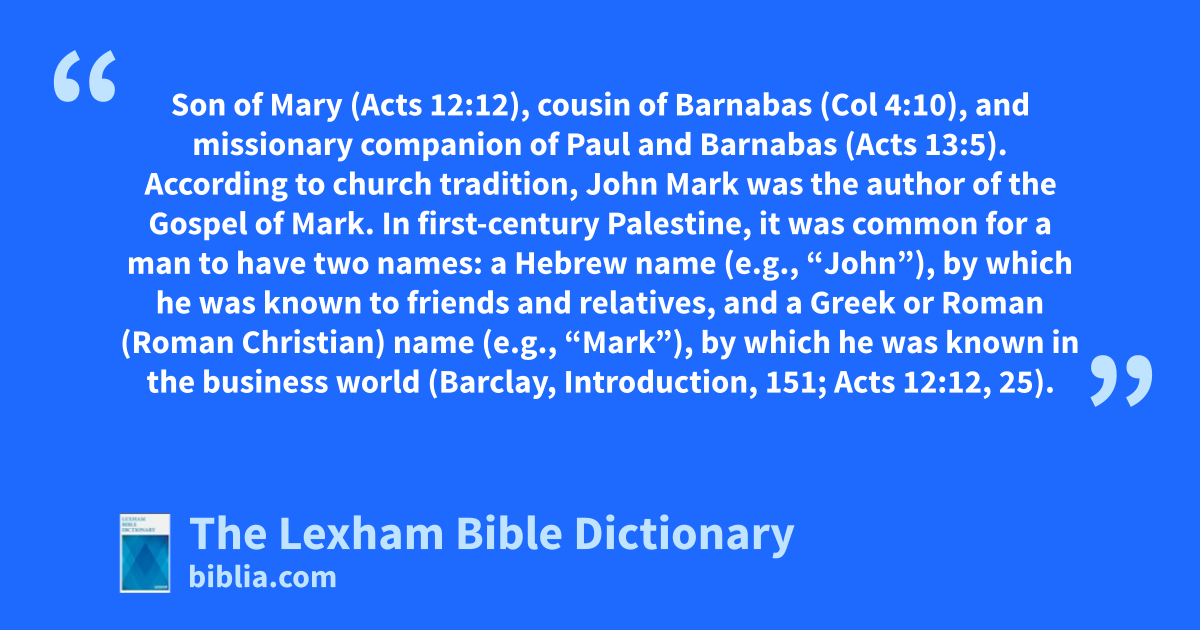 In first-century Palestine, it was common for a man to have two names: a Hebrew name (e.g., “John”), by which he was known to friends and relatives, and a Greek or Roman (Roman Christian) name (e.g., “Mark”), by which he was known in the business world (Barclay, Introduction, 151; Acts 12:12, 25). “Mark” appears to have been a common name in the first century. Consequently, it is difficult to know whether the person mentioned in Acts and Colossians is the “Mark” named elsewhere in the New Testament (2 Tim 4:11; Phlm 24; 1 Pet 5:13; compare with John Mark in Acts 12:12, 25; 13:5, 13; 15:37, 39; Col 4:10).