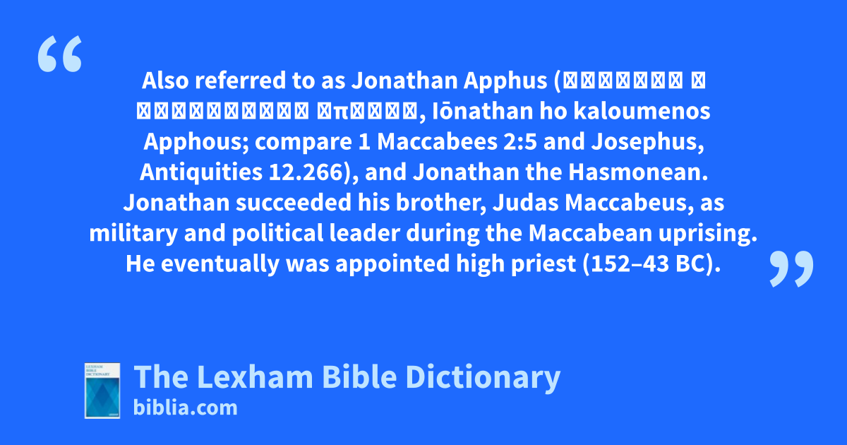 Jonathan Maccabeus Also referred to as Jonathan Apphus (Ιωναθαν ὁ καλούμενος Απφους, Iōnathan ho kaloumenos Apphous; compare 1 Maccabees 2:5 and Josephus, Antiquities 12.266), and Jonathan the Hasmonean. Jonathan succeeded his brother, Judas Maccabeus, as military and political leader during the Maccabean uprising. He eventually was appointed high priest (152–43 bc).