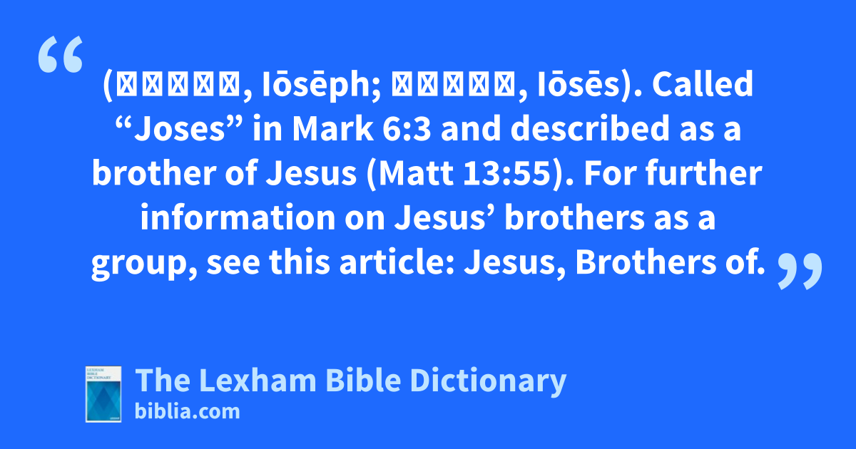 Joseph, Brother of Jesus (Ἰωσήφ, Iōsēph; Ἰωσῆς, Iōsēs). Called “Joses” in Mark 6:3 and described as a brother of Jesus (Matt 13:55). For further information on Jesus’ brothers as a group, see this article: Jesus, Brothers of.