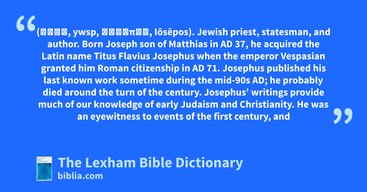 Josephus, Flavius (יוסף, ywsp, Ἰώσηπος, Iōsēpos). Jewish priest, statesman, and author. Born Joseph son of Matthias in ad 37, he acquired the Latin name Titus Flavius Josephus when the emperor Vespasian granted him Roman citizenship in ad 71. Josephus published his last known work sometime during the mid-90s ad; he probably died around the turn of the century. Josephus’ writings provide much of our knowledge of early Judaism and Christianity. He was an eyewitness to events of the first century, and briefly mentions Jesus, John the Baptist, and James, Jesus’ brother (Antiquities 18.63, 18.116, 20.200). His history of the Jewish people includes the first comprehensive interpretation of the Bible by any individual. Though opinionated and partisan, Josephus depicts the diversity of Jewish belief and practice in his day.