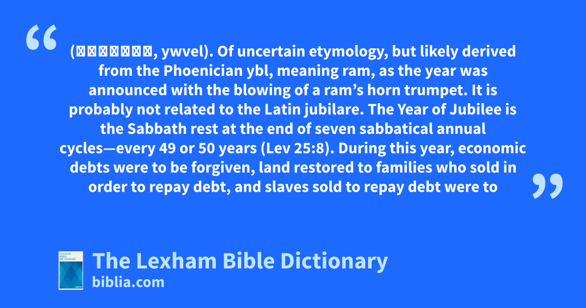 Year of Jubilee (יוֹבֵל, ywvel). Of uncertain etymology, but likely derived from the Phoenician ybl, meaning ram, as the year was announced with the blowing of a ram’s horn trumpet. It is probably not related to the Latin jubilare. The Year of Jubilee is the Sabbath rest at the end of seven sabbatical annual cycles—every 49 or 50 years (Lev 25:8). During this year, economic debts were to be forgiven, land restored to families who sold in order to repay debt, and slaves sold to repay debt were to be liberated. While clearly specified in the biblical text, there is no biblical or extrabiblical evidence that the practice of a Year of Jubilee was ever celebrated. The term is only found in the Pentateuch with most references in Lev 25–27.