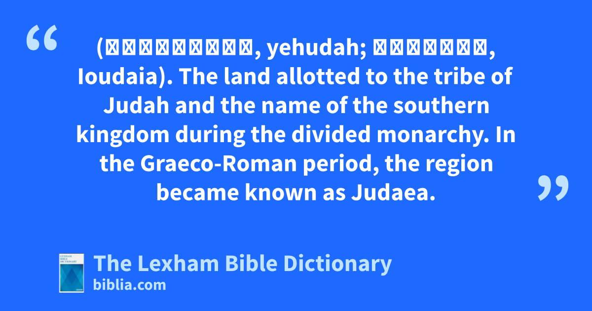 Judah (יְהוּדָ֖ה, yehudah; Ἰουδαία, Ioudaia). The land allotted to the tribe of Judah and the name of the southern kingdom during the divided monarchy. In the Graeco-Roman period, the region became known as Judaea.
