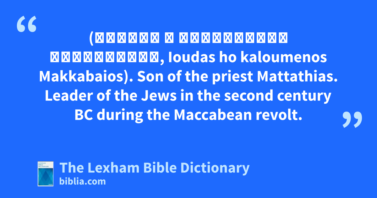 Judas Maccabeus (Ιουδας ὁ καλούμενος Μακκαβαῖος, Ioudas ho kaloumenos Makkabaios). Son of the priest Mattathias. Leader of the Jews in the second century bc during the Maccabean revolt.