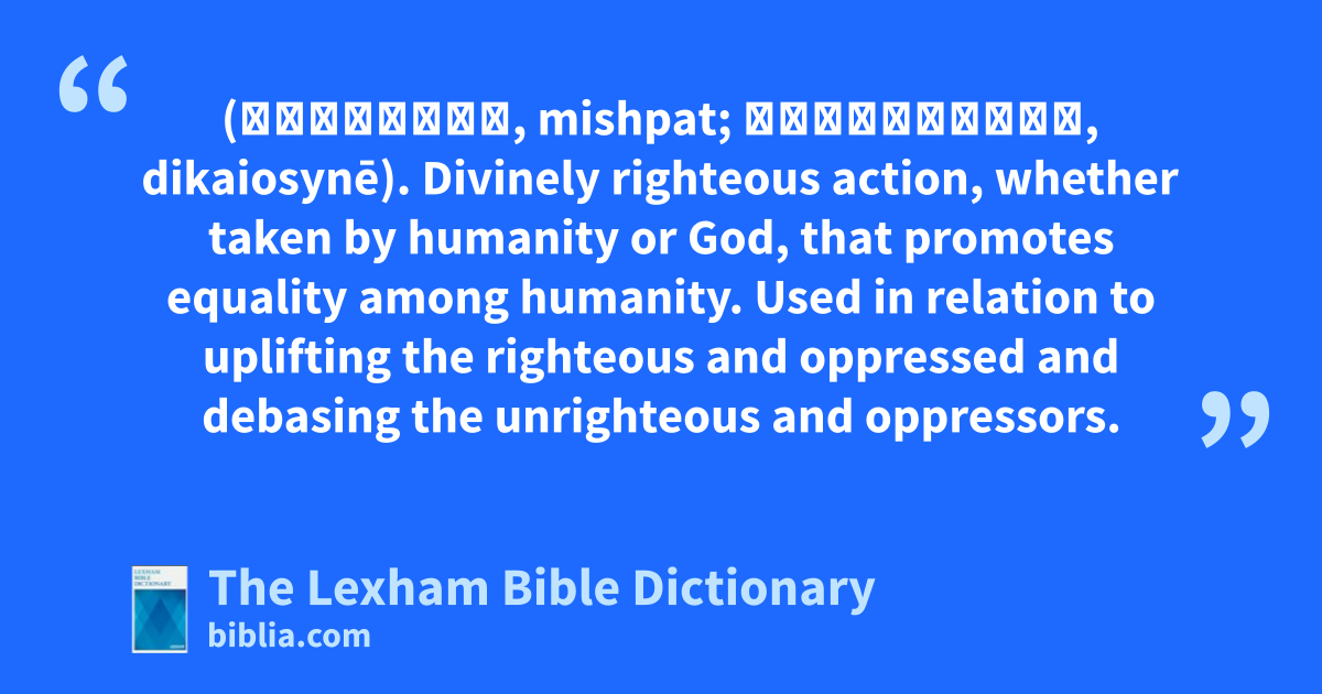Justice (מִשְפָּט, mishpat; δικαιοσύνη, dikaiosynē). Divinely righteous action, whether taken by humanity or God, that promotes equality among humanity. Used in relation to uplifting the righteous and oppressed and debasing the unrighteous and oppressors.