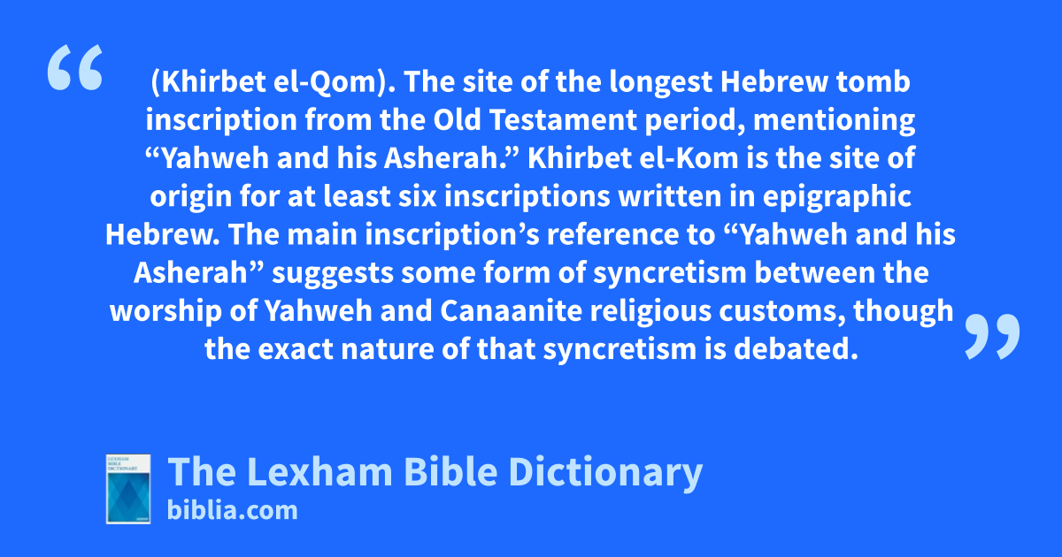 Kom, Khirbet El- (Khirbet el-Qom). The site of the longest Hebrew tomb inscription from the Old Testament period, mentioning “Yahweh and his Asherah.” Khirbet el-Kom is the site of origin for at least six inscriptions written in epigraphic Hebrew. The main inscription’s reference to “Yahweh and his Asherah” suggests some form of syncretism between the worship of Yahweh and Canaanite religious customs, though the exact nature of that syncretism is debated.