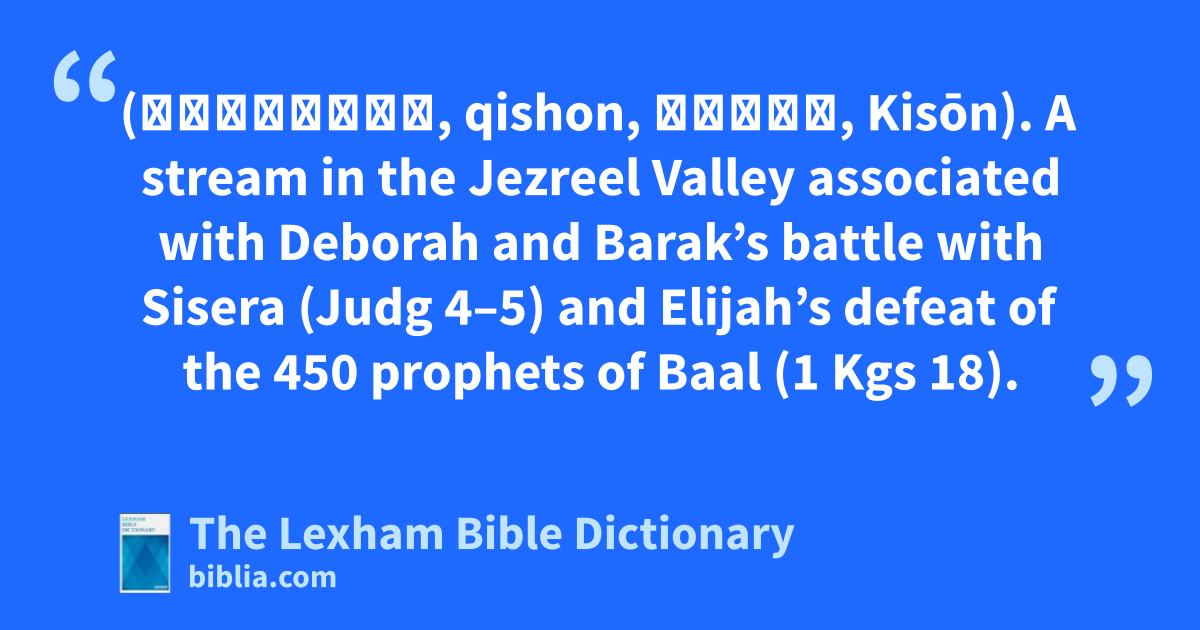 Kishon (קִישׁוֹן, qishon, Κισων, Kisōn). A stream in the Jezreel Valley associated with Deborah and Barak’s battle with Sisera (Judg 4–5) and Elijah’s defeat of the 450 prophets of Baal (1 Kgs 18).