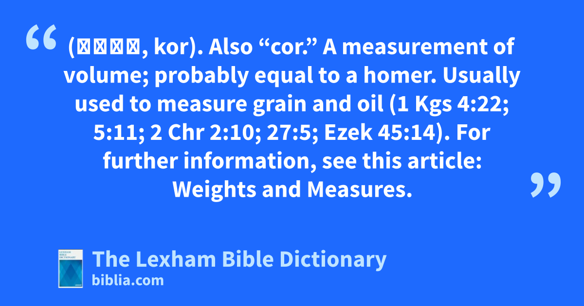 Kor (כֹּר, kor). Also “cor.” A measurement of volume; probably equal to a homer. Usually used to measure grain and oil (1 Kgs 4:22; 5:11; 2 Chr 2:10; 27:5; Ezek 45:14). For further information, see this article: Weights and Measures.