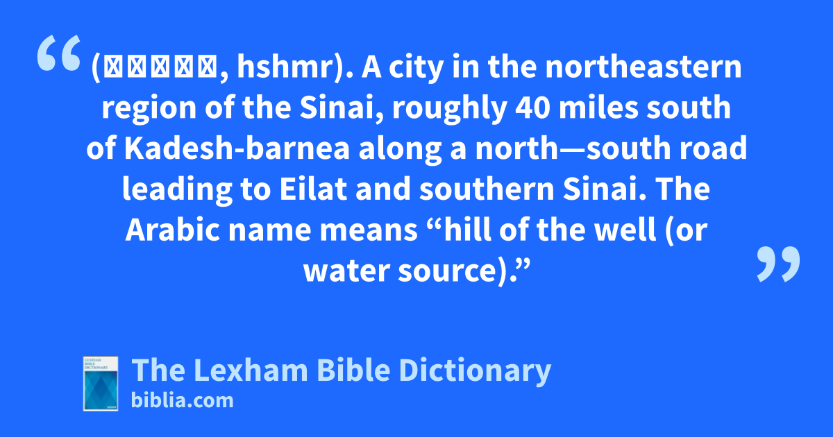 Kuntillet Ajrud (השׁמר, hshmr). A city in the northeastern region of the Sinai, roughly 40 miles south of Kadesh-barnea along a north—south road leading to Eilat and southern Sinai. The Arabic name means “hill of the well (or water source).”