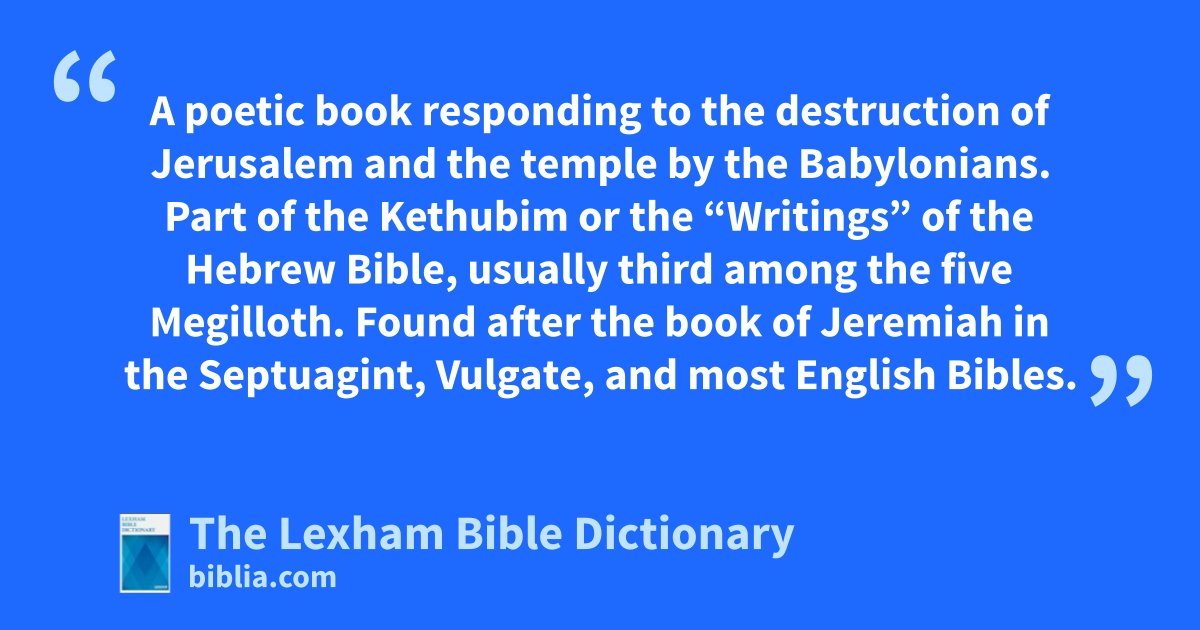 Lamentations, Book Of A poetic book responding to the destruction of Jerusalem and the temple by the Babylonians. Part of the Kethubim or the “Writings” of the Hebrew Bible, usually third among the five Megilloth. Found after the book of Jeremiah in the Septuagint, Vulgate, and most English Bibles.