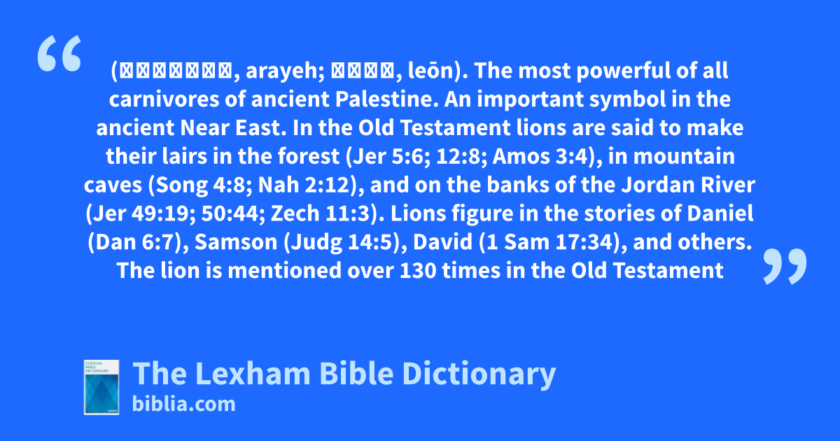 Lion (אַרַיֵה, arayeh; λέων, leōn). The most powerful of all carnivores of ancient Palestine. An important symbol in the ancient Near East. In the Old Testament lions are said to make their lairs in the forest (Jer 5:6; 12:8; Amos 3:4), in mountain caves (Song 4:8; Nah 2:12), and on the banks of the Jordan River (Jer 49:19; 50:44; Zech 11:3). Lions figure in the stories of Daniel (Dan 6:7), Samson (Judg 14:5), David (1 Sam 17:34), and others.