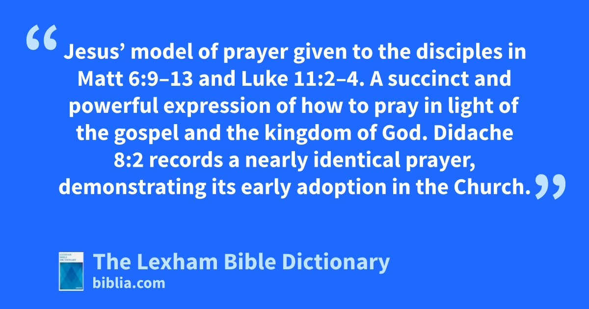 Lord’s Prayer Jesus’ model of prayer given to the disciples in Matt 6:9–13 and Luke 11:2–4. A succinct and powerful expression of how to pray in light of the gospel and the kingdom of God. Didache 8:2 records a nearly identical prayer, demonstrating its early adoption in the Church.