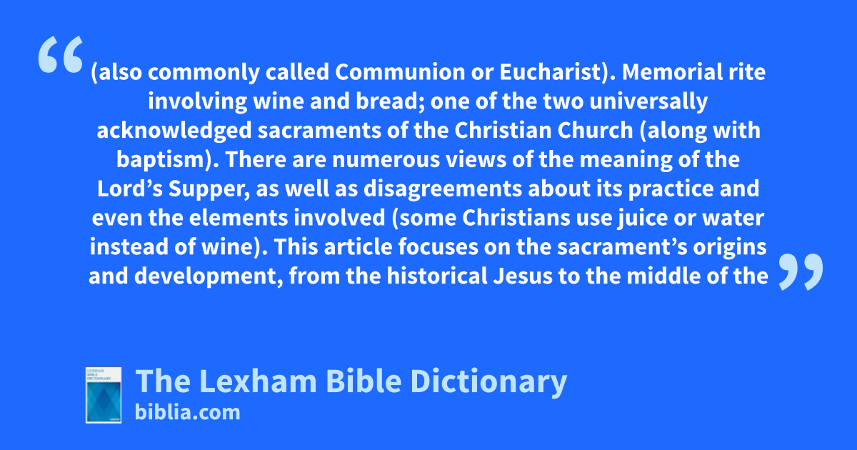 Lord’s Supper (also commonly called Communion or Eucharist). Memorial rite involving wine and bread; one of the two universally acknowledged sacraments of the Christian Church (along with baptism). There are numerous views of the meaning of the Lord’s Supper, as well as disagreements about its practice and even the elements involved (some Christians use juice or water instead of wine).