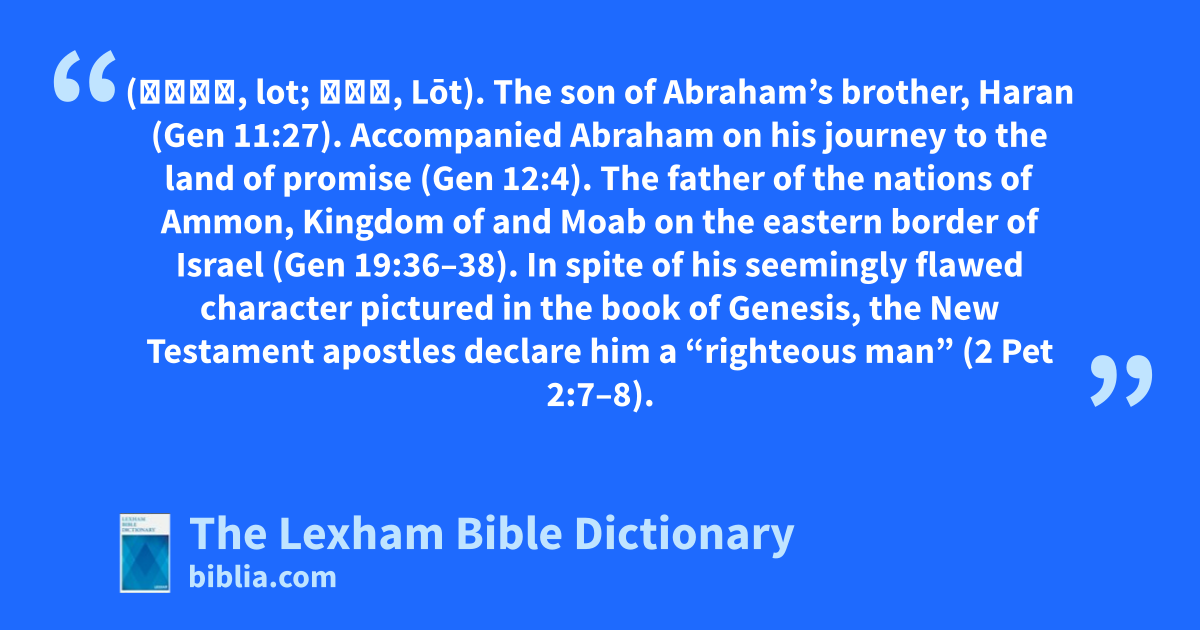 Lot, Son of Haran (לוֹט, lot; Λωτ, Lōt). The son of Abraham’s brother, Haran (Gen 11:27). Accompanied Abraham on his journey to the land of promise (Gen 12:4). The father of the nations of Ammon, Kingdom of and Moab on the eastern border of Israel (Gen 19:36–38). In spite of his seemingly flawed character pictured in the book of Genesis, the New Testament apostles declare him a “righteous man” (2 Pet 2:7–8).