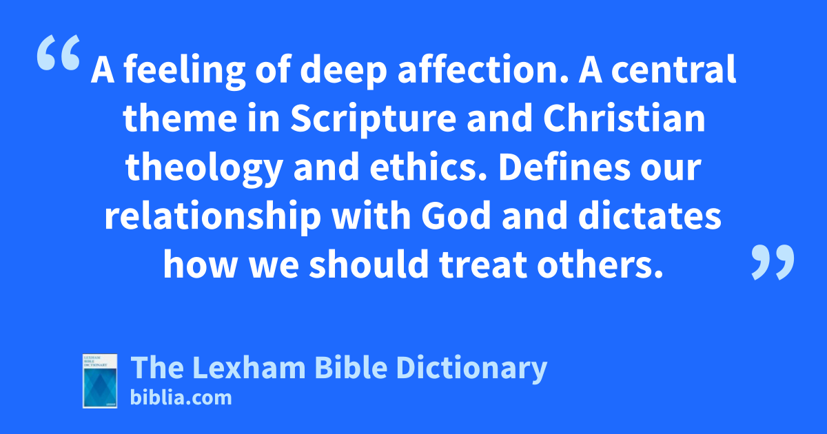 Love A feeling of deep affection. A central theme in Scripture and Christian theology and ethics. Defines our relationship with God and dictates how we should treat others.
