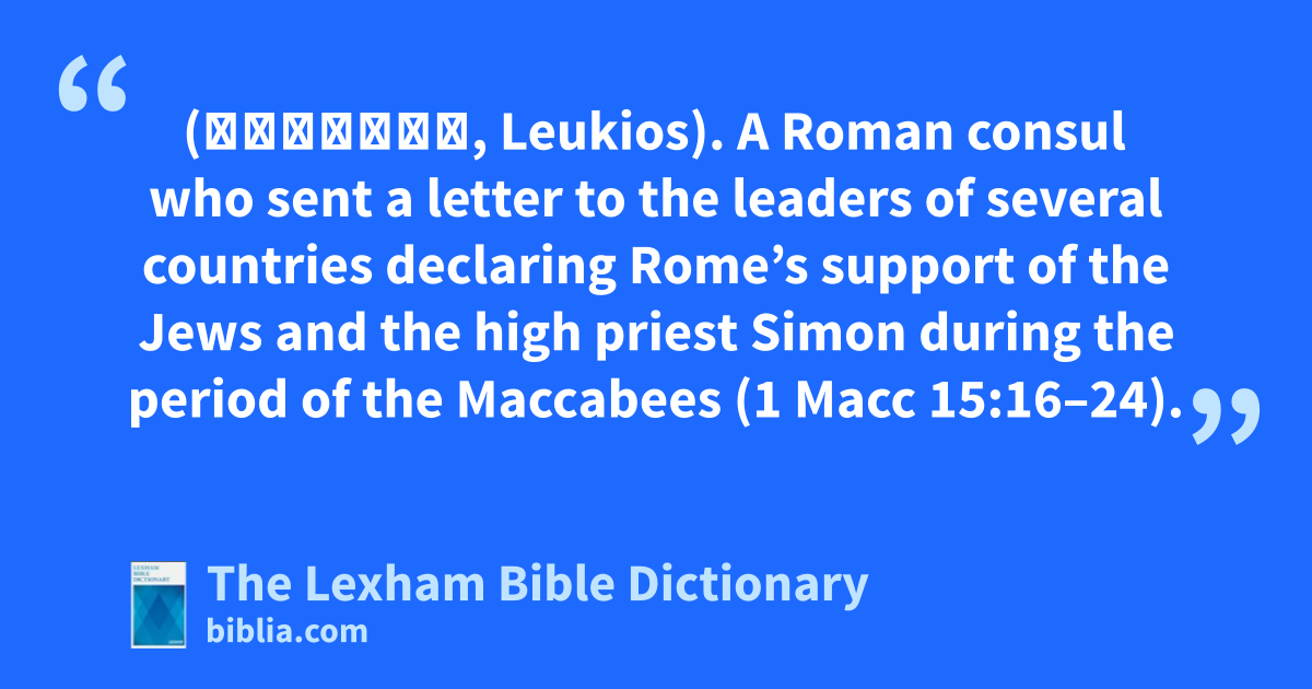 Lucius the Consul (Λεύκιος, Leukios). A Roman consul who sent a letter to the leaders of several countries declaring Rome’s support of the Jews and the high priest Simon during the period of the Maccabees (1 Macc 15:16–24).