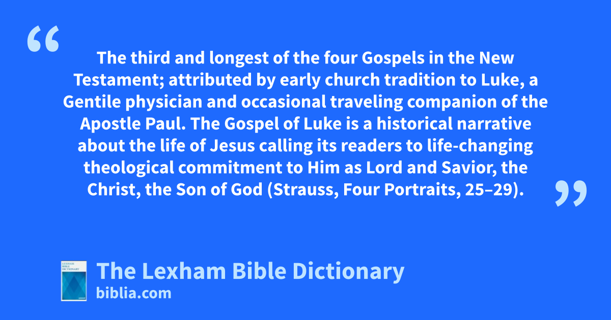 Luke, Gospel Of The third and longest of the four Gospels in the New Testament; attributed by early church tradition to Luke, a Gentile physician and occasional traveling companion of the Apostle Paul. The Gospel of Luke is a historical narrative about the life of Jesus calling its readers to life-changing theological commitment to Him as Lord and Savior, the Christ, the Son of God (Strauss, Four Portraits, 25–29).