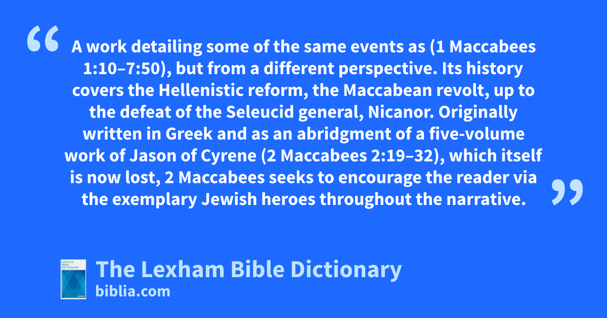 Maccabees, Second Book of The A work detailing some of the same events as (1 Maccabees 1:10–7:50), but from a different perspective. Its history covers the Hellenistic reform, the Maccabean revolt, up to the defeat of the Seleucid general, Nicanor. Originally written in Greek and as an abridgment of a five-volume work of Jason of Cyrene (2 Maccabees 2:19–32), which itself is now lost, 2 Maccabees seeks to encourage the reader via the exemplary Jewish heroes throughout the narrative.