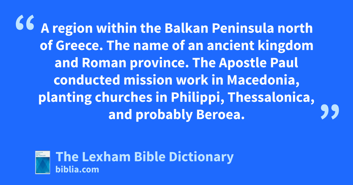 Macedonia A region within the Balkan Peninsula north of Greece. The name of an ancient kingdom and Roman province. The Apostle Paul conducted mission work in Macedonia, planting churches in Philippi, Thessalonica, and probably Beroea.