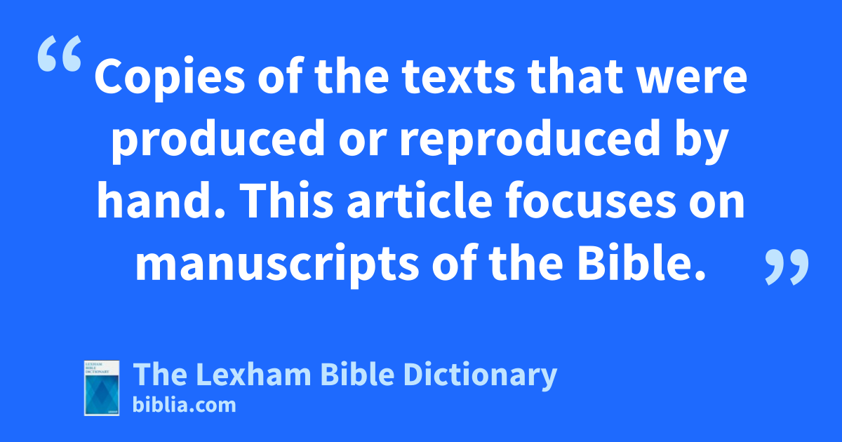 Manuscripts Copies of the texts that were produced or reproduced by hand. This article focuses on manuscripts of the Bible.
