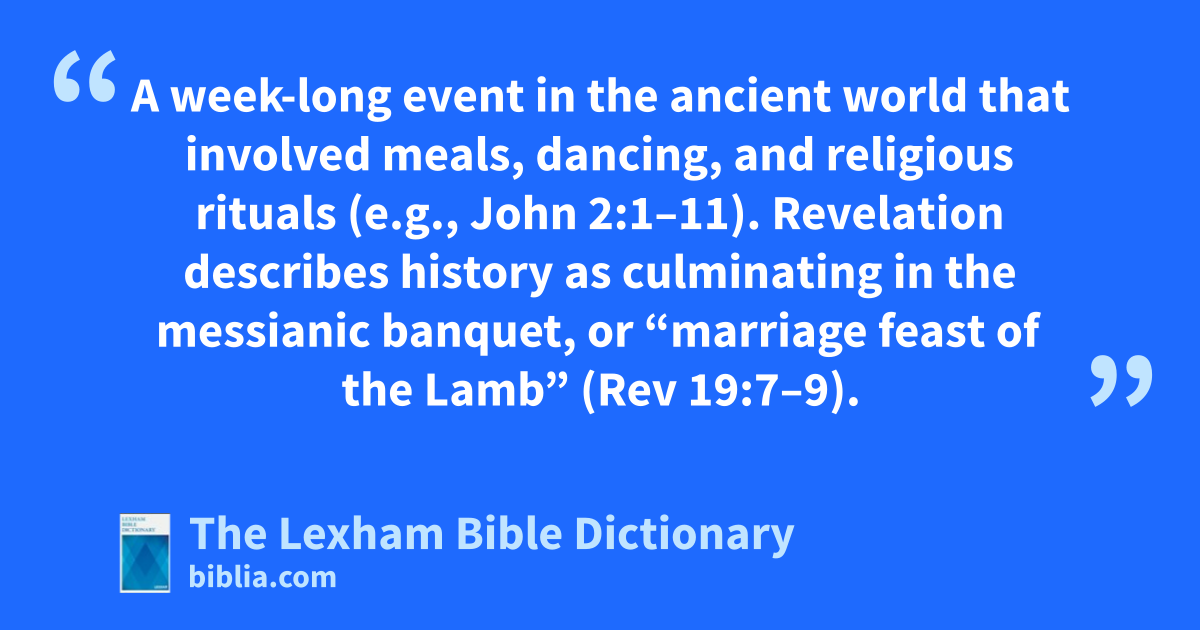 Marriage Feast A week-long event in the ancient world that involved meals, dancing, and religious rituals (e.g., John 2:1–11). Revelation describes history as culminating in the messianic banquet, or “marriage feast of the Lamb” (Rev 19:7–9).
