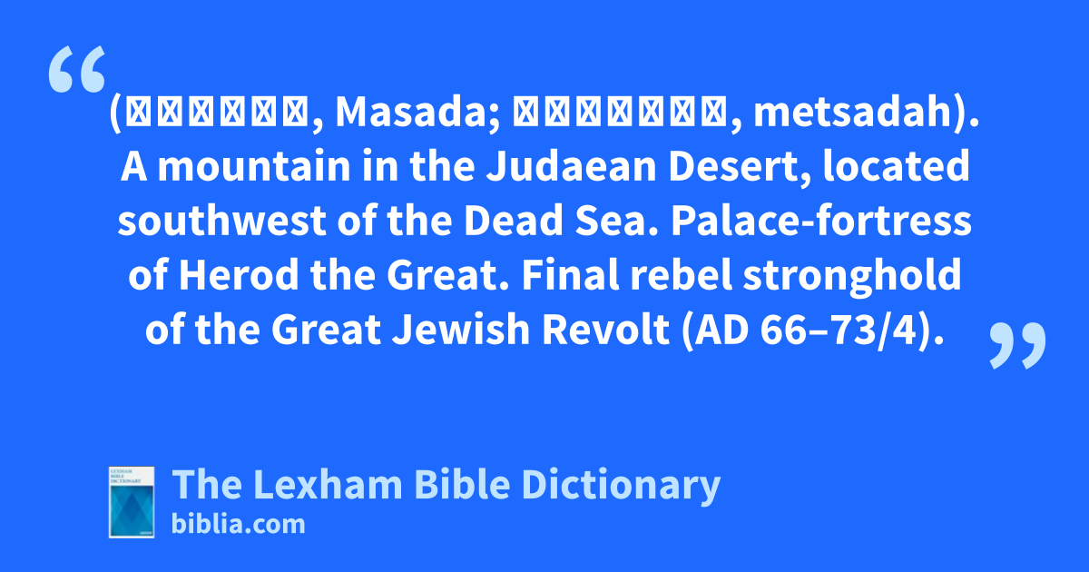 Masada (Μασάδα, Masada; מְצָדָה, metsadah). A mountain in the Judaean Desert, located southwest of the Dead Sea. Palace-fortress of Herod the Great. Final rebel stronghold of the Great Jewish Revolt (ad 66–73/4).
