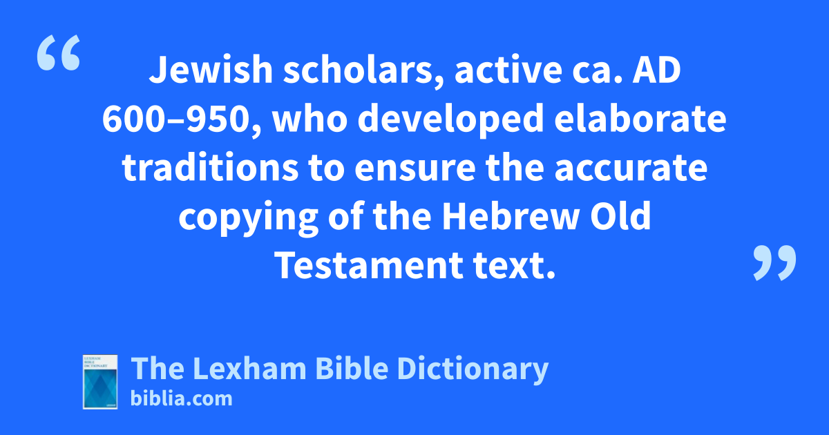 Masoretes Jewish scholars, active ca. ad 600–950, who developed elaborate traditions to ensure the accurate copying of the Hebrew Old Testament text.
