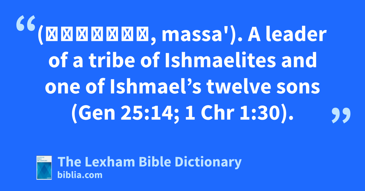 Massa, Son of Ishmael (מַשָּׂא, massa'). A leader of a tribe of Ishmaelites and one of Ishmael’s twelve sons (Gen 25:14; 1 Chr 1:30).