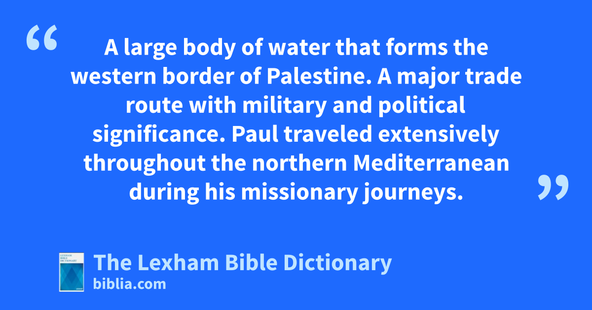 Mediterranean Sea A large body of water that forms the western border of Palestine. A major trade route with military and political significance. Paul traveled extensively throughout the northern Mediterranean during his missionary journeys.