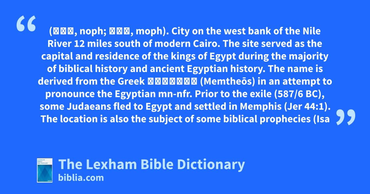 Memphis (נֹף, noph; מֹף, moph). City on the west bank of the Nile River 12 miles south of modern Cairo. The site served as the capital and residence of the kings of Egypt during the majority of biblical history and ancient Egyptian history. The name is derived from the Greek Μέμθεως (Memtheōs) in an attempt to pronounce the Egyptian mn-nfr.