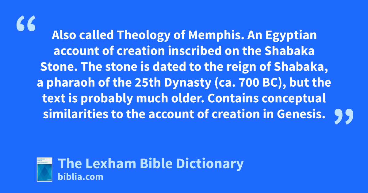 Memphite Theology Also called Theology of Memphis. An Egyptian account of creation inscribed on the Shabaka Stone. The stone is dated to the reign of Shabaka, a pharaoh of the 25th Dynasty (ca. 700 bc), but the text is probably much older. Contains conceptual similarities to the account of creation in Genesis.