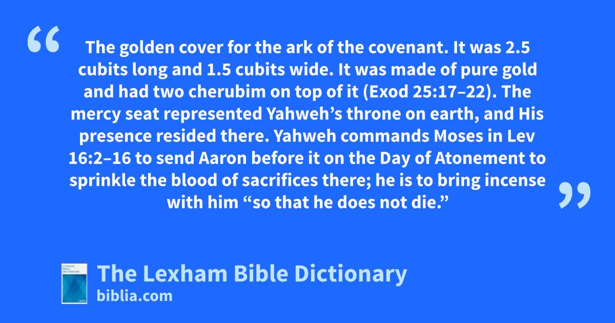 Mercy Seat The golden cover for the ark of the covenant. It was 2.5 cubits long and 1.5 cubits wide. It was made of pure gold and had two cherubim on top of it (Exod 25:17–22). The mercy seat represented Yahweh’s throne on earth, and His presence resided there. Yahweh commands Moses in Lev 16:2–16 to send Aaron before it on the Day of Atonement to sprinkle the blood of sacrifices there; he is to bring incense with him “so that he does not die.”