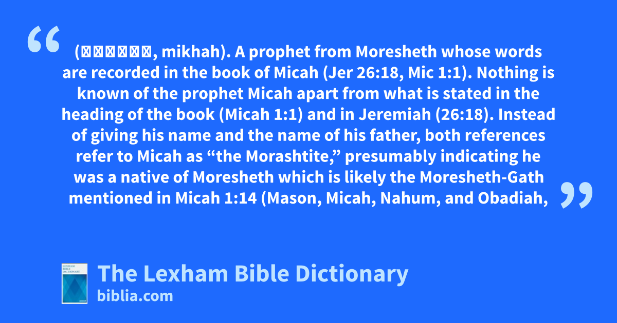 Micah the Prophet (מִיכָה, mikhah). A prophet from Moresheth whose words are recorded in the book of Micah (Jer 26:18, Mic 1:1). Nothing is known of the prophet Micah apart from what is stated in the heading of the book (Micah 1:1) and in Jeremiah (26:18). Instead of giving his name and the name of his father, both references refer to Micah as “the Morashtite,” presumably indicating he was a native of Moresheth which is likely the Moresheth-Gath mentioned in Micah 1:14 (Mason, Micah, Nahum, and Obadiah, 23). Moresheth-Gath was likely about 25 miles southwest of Jerusalem, between the central hill country of Judah and the coastal plain controlled by the Philistines. Jeremiah indicates that Micah prophesied during the reign of Hezekiah. The superscription to the book of Micah also places him in the earlier reigns of Ahaz and Jotham, making him a contemporary of Isaiah (compare Isa 1:1).